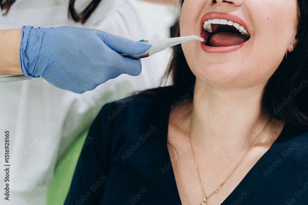 Close-up of a woman's mouth with white teeth during a dental procedure in a clinic.