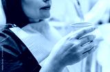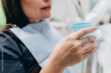 Close-up of a woman's mouth with white teeth during a dental procedure in a clinic.
