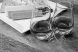 Whiskey and cheese pairing, tasting speyside whisky glasses and plate with sliced cheddar, blue stilton and blue shropshire cheeses, Great Britain food and drink