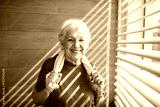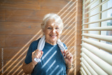 Happy senior woman after home workout standing by sunny window with towel around neck