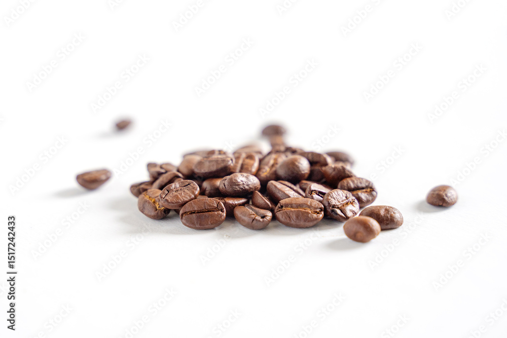 Coffee beans on white background. Pile of coffee beans. Close up image.