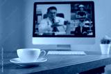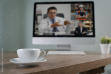 Online video conference and Coffee cupwhite coffee cup and saucer placed wooden desk front of computer monitor showing video call with doctor