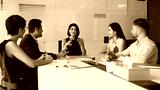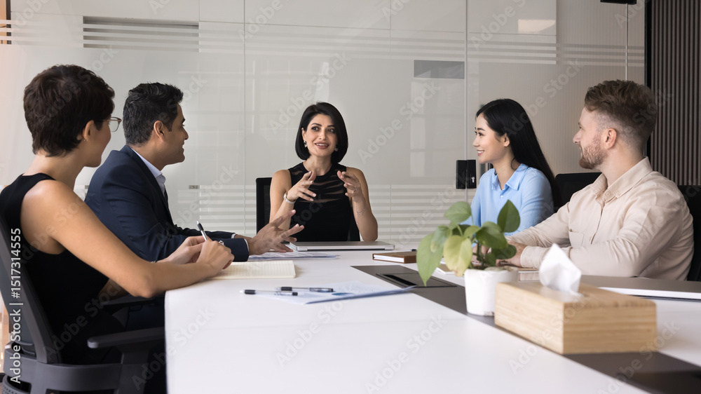 Attractive businesswoman and teammates collaborate on presentation, analyze status of ongoing project, discussing next steps, provide feedback and planning improvements, gathered at conference table