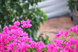 Soft Pink Bougainvillea Framing Urban Skyline - Dreamy Summer Garden Concep