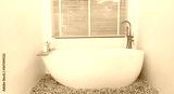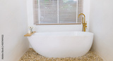 An elegant white freestanding bathtub rests on pebbles in a minimalist bathroom. Complemented by a golden faucet and a wooden tray with flowers and a candle.