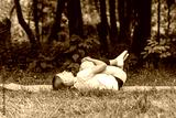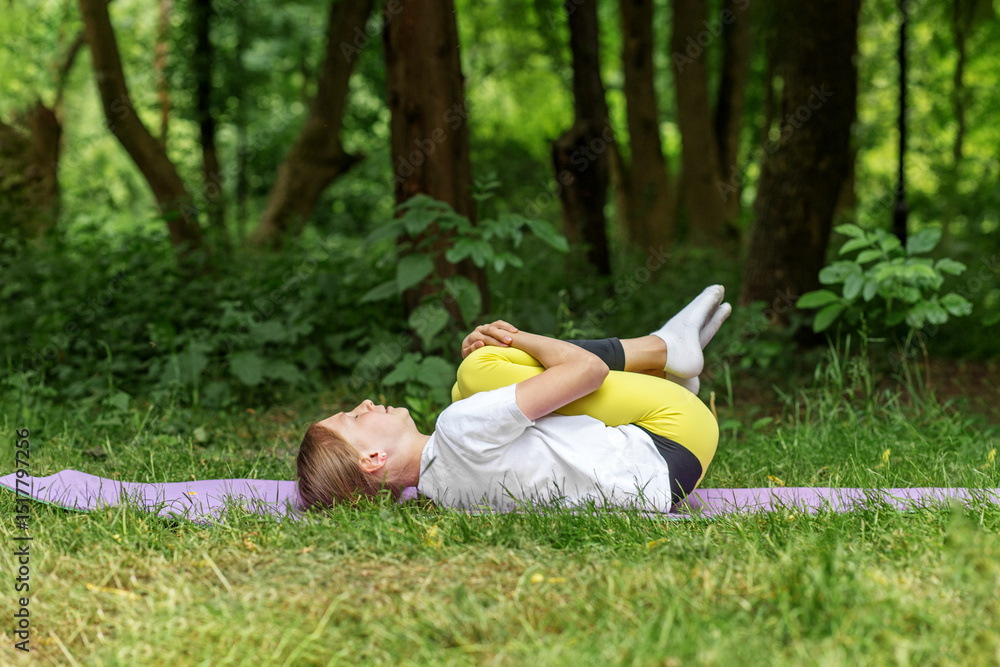 Practicing yoga outdoors with focus on balance and stretching during a sunny day
