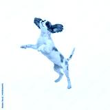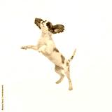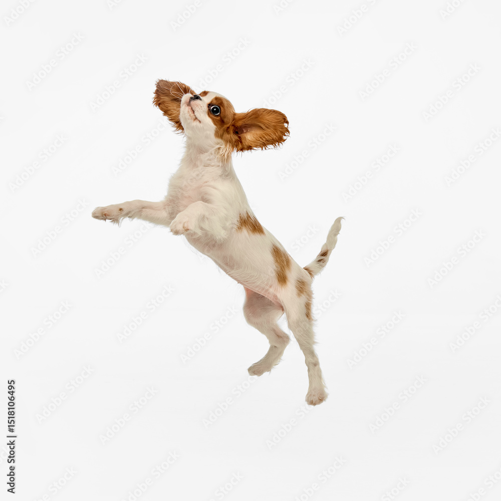 Dynamic photo of Small King Charles Spaniel puppy jumping of joy and happiness against white studio background. Concept of pet grooming, self-care, healthy behavior, vet ad. ad