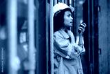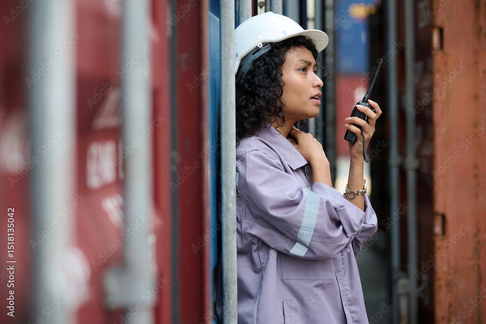 Worker or engineer using walkie talkie and talking about work in containers warehouse storage