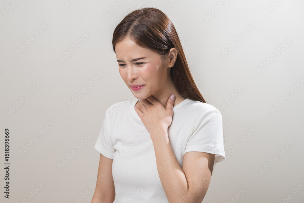 Sickness in inflaming asian young woman, girl use hand check self touch at sore throat, pain thyroid gland on neck or disease reflux, acid of suffer people on wall background. Medical and healthcare.