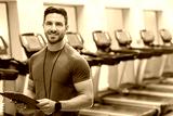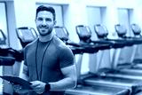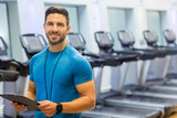 Male gym instructor standing in gym by treadmills holding clipboard wearing smartwatch and whistle