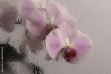 Smoke selected Soft focus beige pink phalaenopsis Orchid Flower through glass with wet water drops. Abstract natural blur background.