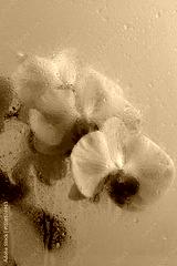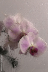 Smoke selected Soft focus beige pink phalaenopsis Orchid Flower through glass with wet water drops. Abstract natural blur background.