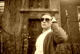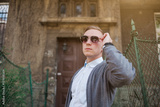Portrait of young stylish man with glasses walking on the street of old city