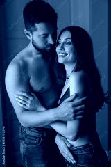 Woman cuddling her attractive partner in house lovers touching tenderly