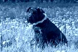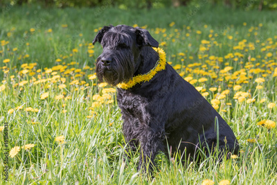 Old Giant Black Schnauzer Dog with a wreath of dandelion on the neck is sitting at the blossoming dandelion meadow. Horizontally.