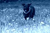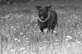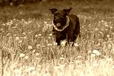 Barking Giant Black Schnauzer Dog with a wreath of dandelion on the neck is standing at the blossoming dandelion meadow. Horizontally.