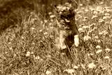 Adorable crossbreed brown dog is in a jump running against the camera at the blossoming dandelion meadow. Horizontally.