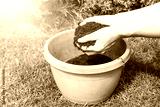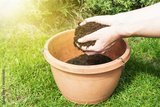 Female hands are putting soil into a flower pot outdoors. Photo is edited by sun lights in the upper left corner.
