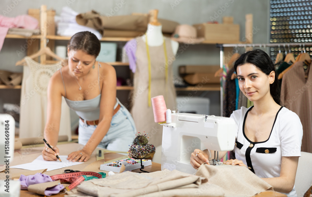 Female dressmakers work together to create custom clothing. Fashion designer stands near a table and draws a sketch on paper next to a seamstress who works on a typewriter