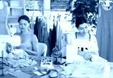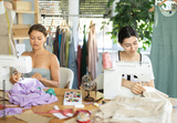 Two young female seamstresses working side by side at sewing machines in tailoring studio, focusing on assembling fabric pieces with precision and control