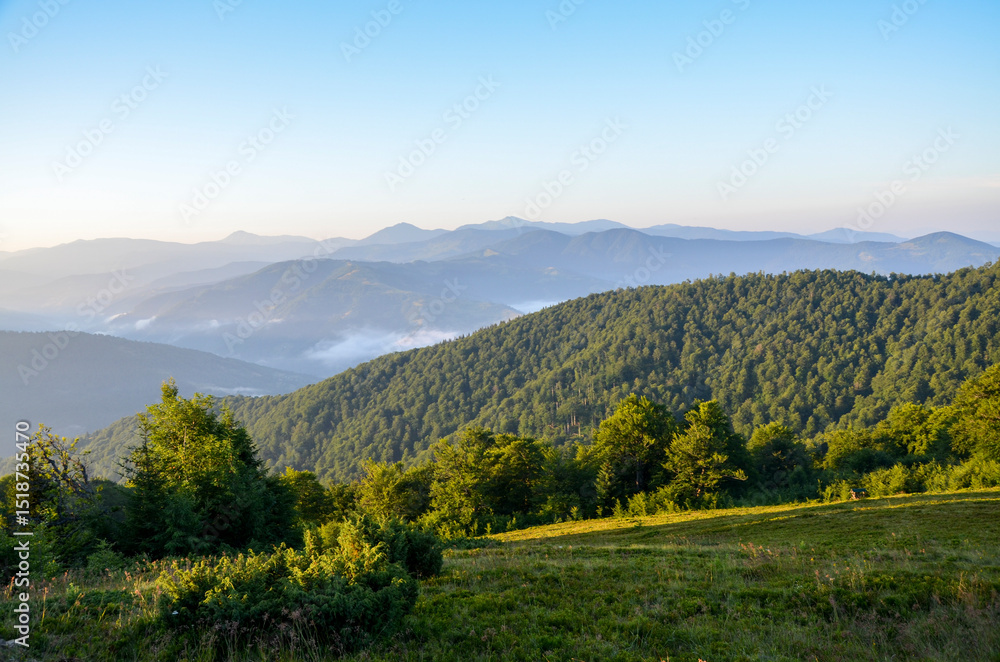 Misty mountains and forested hills during an early morning surrounded by serene greenery in nature.Carpathians, Ukraine