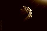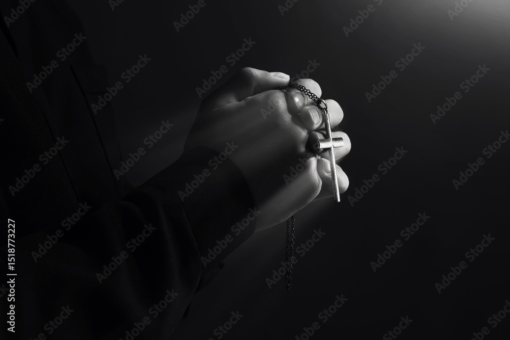 Priest with cross illuminated by holy light praying, closeup. Black-and-white effect