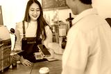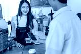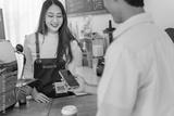Customer makes mobile payment at trendy coffee shop, urban daylight, engaging interaction
