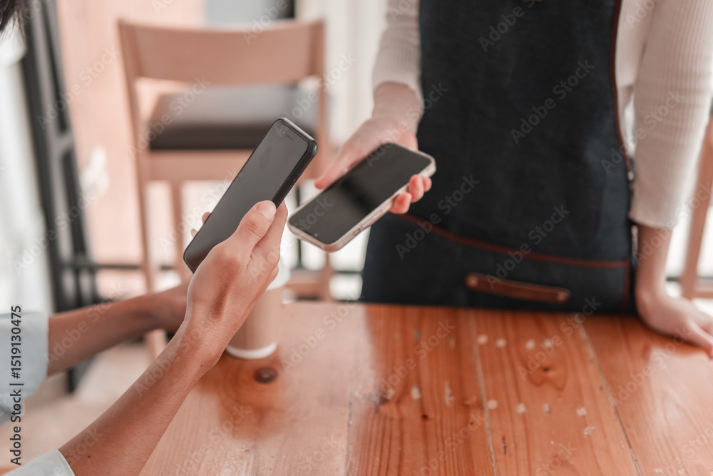 Mobile payment exchange between customers and staff in a coffee shop urban setting everyday life