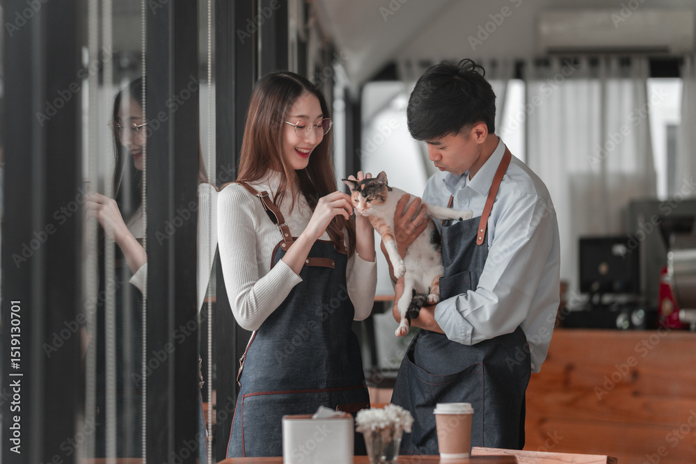 Couple playfully interacts with their cat indoors, cozy lifestyle photography, warm atmosphere