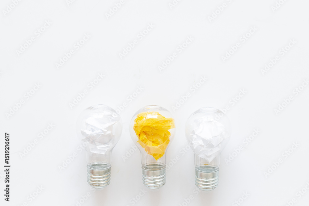 Yellow paper in light bulb, top view. Education concept. Creative idea and business innovation