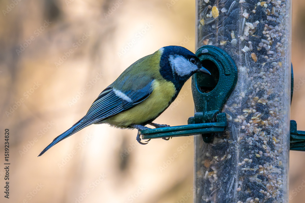 The Great Tit, Parus major from the tit family Paridae, perched on a bird feeder containing birdseed.