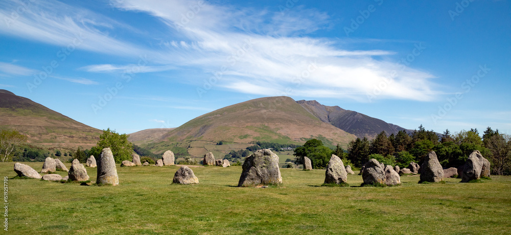 5000 year old Castlerigg Prehistoric Stone Circle near Keswick in the Lake District, Cumbria in the northwest of England. Built in the Neolithic period it is one of the oldest stone circles in Europe