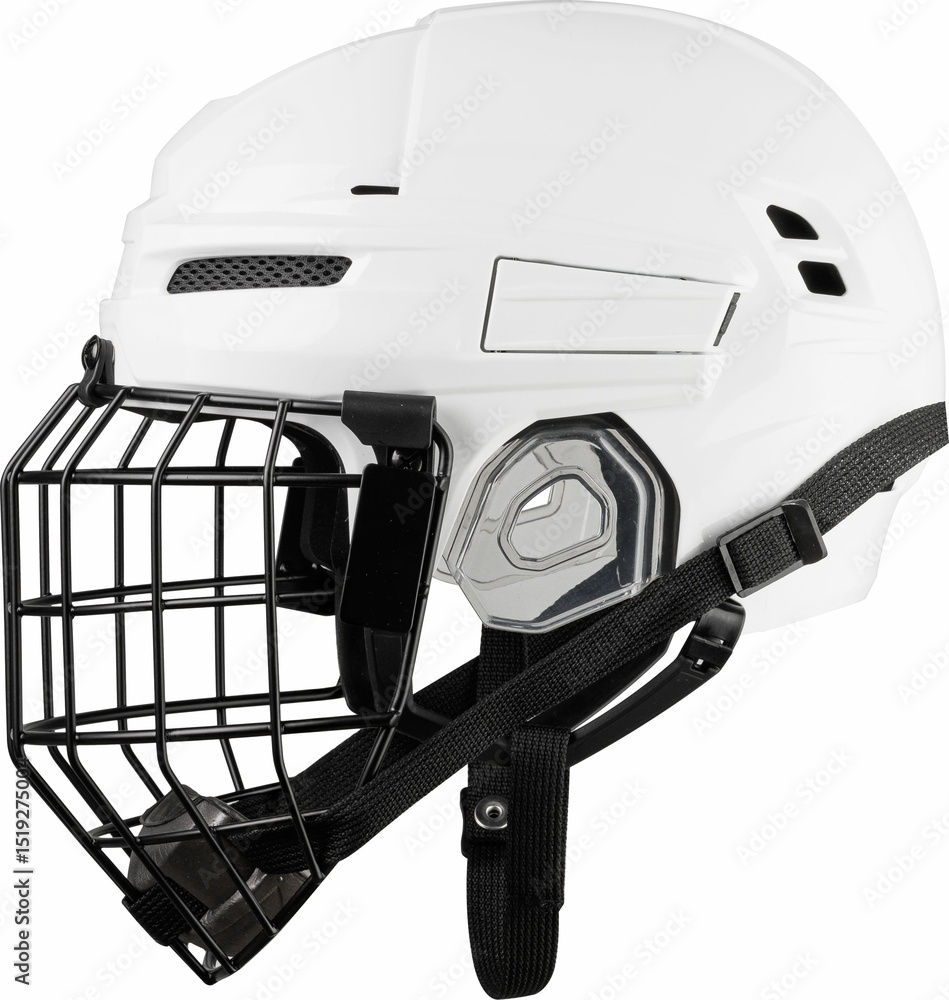 White Protective Ice Hockey Helmet with Transparent Plastic Visor on White Background