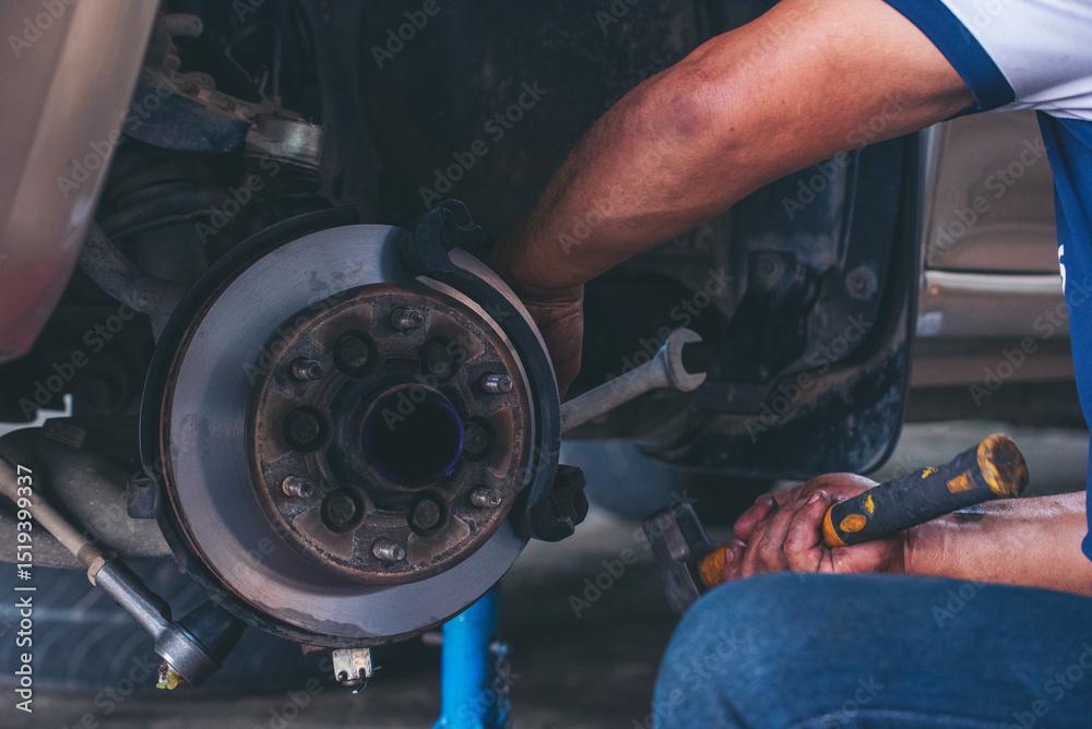 Mechanic car service auto garage in automotive mobile center. Technician workshop repair engine motor vehicles service mechanical engineering business. Automobile mechanic hands car repairs technic