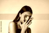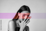 Young woman expressing emotions with hands covering her face in a stylized monochrome and colored setting
