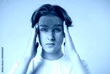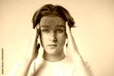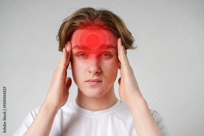 Young man experiencing headache in a minimal background setting while holding his forehead in discomfort