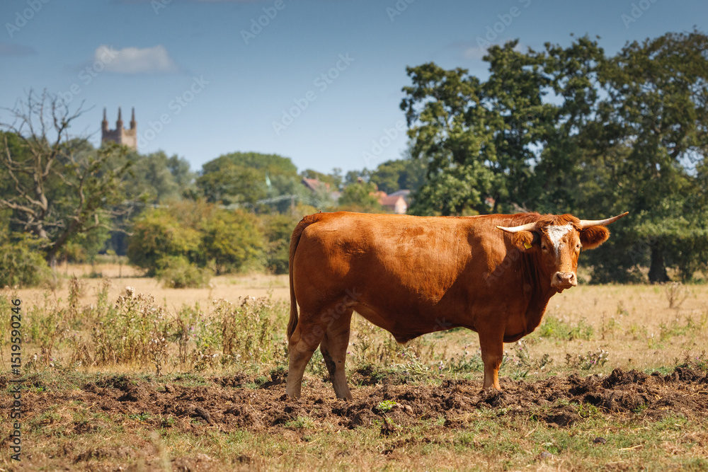 cow in foreground with church in the background rural setting