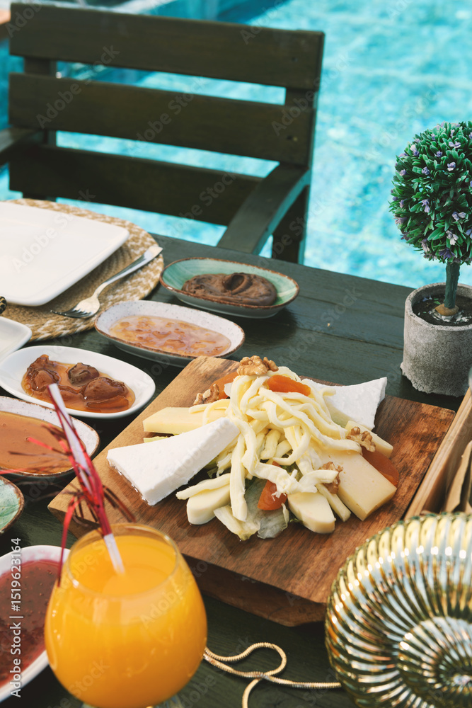 A detailed close-up of the breakfast cheese selection showcasing various textures and types from the luxurious spread