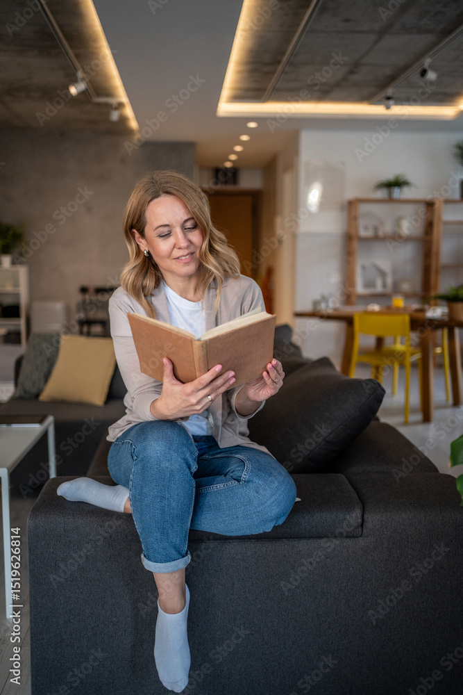 Woman enjoying a book in her modern apartment living room