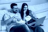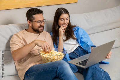 Happy young woman and her boyfriend laughing and eating popcorn from bowl
