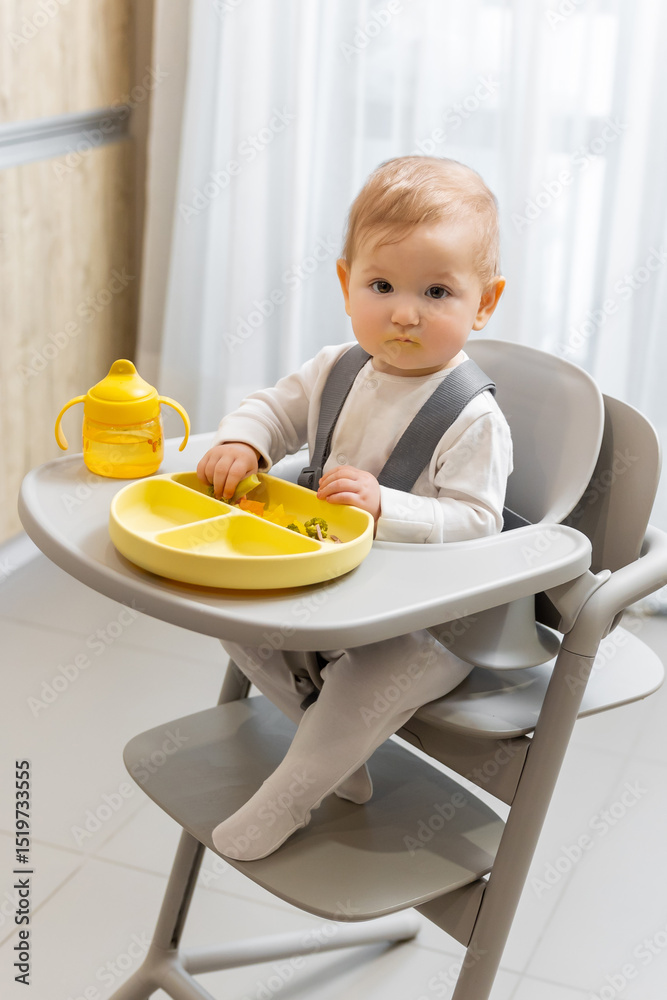 Sweet little baby boy sitting on his chair and eating something from the plate