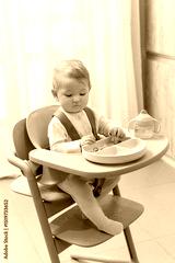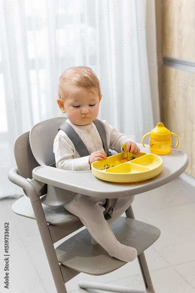 Sweet little baby boy sitting on his chair and eating something from the plate