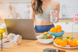 fit Asian female in sportswear enjoys a colorful fruit shake and fresh mineral water while unwinding at home in the early hours, embracing a mindful lifestyle and remote work wellness routine