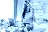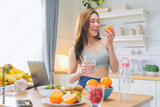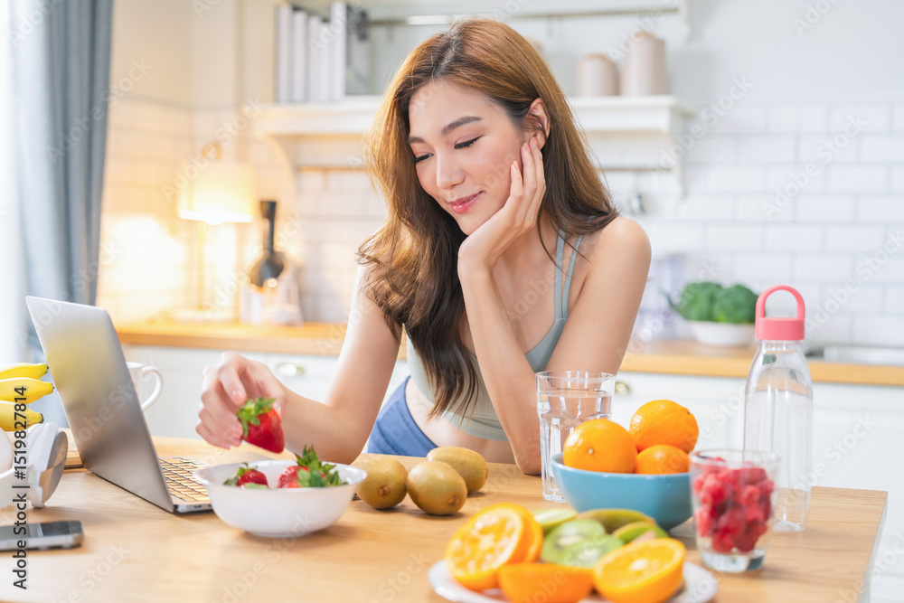 fit Asian female in sportswear enjoys a colorful fruit shake and fresh mineral water while unwinding at home in the early hours, embracing a mindful lifestyle and remote work wellness routine