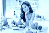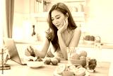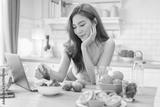 ealthy Asian woman in sporty casualwear enjoys a nutritious smoothie breakfast at home after her morning workout, smiling as she checks her social media channel and posts a photo as part of her daily