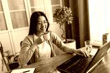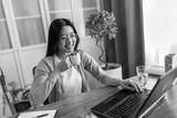 Young Thai Woman Drinking Coffee During Online Business Video Call..