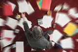 Accounting and processing a mess of stressful paperwork. Man doing challenging work with taxes, overhead shot with zoom blur effect