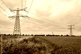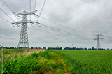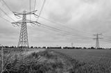 Footpath between a wheatfield and a reed-lined ditch, under power lines, near Strijen, The Netherlands