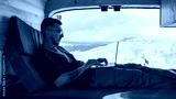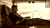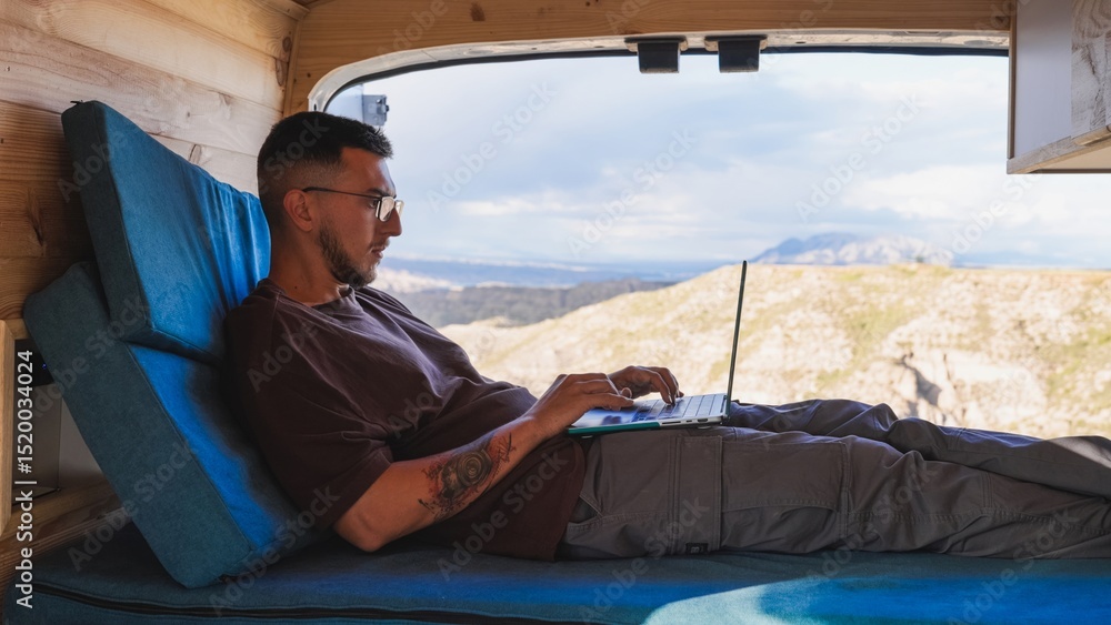 Freelancer working remotely on laptop in camper van enjoying mountain view in gorafe, spain