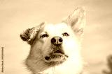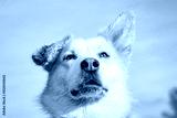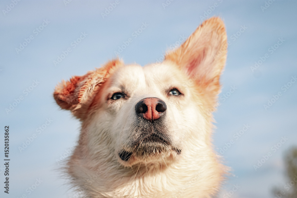 Close up of adopted mixed-breed husky dog with blue eyes enjoying a sunny day outdoors